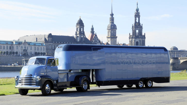 Was könnte technikorientierte Menschen mehr anziehen, als die Symbiose aus patiniertem Design und patentierter Ingenieurskunst! Eindrucksvoll gelöst ist dieser scheinbare Widerspruch im Showtruck der YADOS GmbH. Unter der Haube der Zugmaschine schlummern über 400 PS und modernste Antriebstechnik. Automatikgetriebe, Klimaanlage und Navigationsgerät treffen auf das nostalgische Design eines 50er Chevrolet COE.