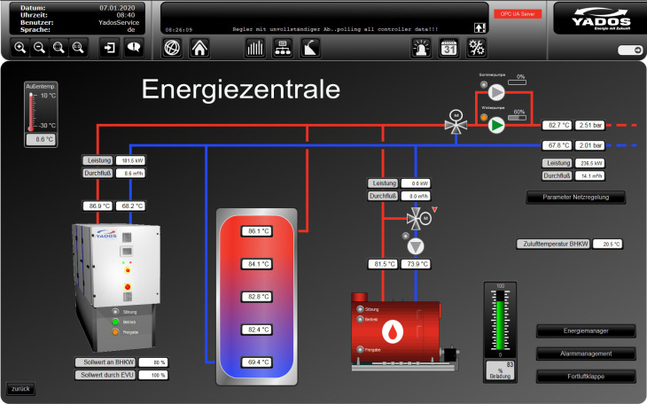 Eine stabile und versorgungssichere Wärmeversorgung, in der unterschiedliche Erzeugungstechnologien, Energieträger und Verbraucher integriert sind, erfordert eine intelligente Steuerung per Leit- und Kommunikationssystem. Übergeordnete Steuerungssysteme vernetzen sämtliche Anlagenkomponenten – etwa Energiezentrale mit BHKW, Wärmeübergabestation, Heizungsverteiler und Trinkwassersystem – und ermöglichen es, vorhandene ökonomische und ökologische Einsparmöglichkeiten zu identifizieren. Eine hochentwickelte Leittechnik ist zentraler Teil des „Alles-aus-einer-Hand-Portfolios“ von Yados. „YADO|LINK steuert konstant die komplette Anlagentechnologie. Das übergeordnete, Bus-basierte Regelsystem überwacht, erfasst und analysiert alle relevanten Daten in Echtzeit. Auf dieser Basis können dann weitere konkrete Optimierungsmaßnahmen abgeleitet werden“, erörtert Mahlitz. Die erfassten Betriebsstunden, Energieflüsse und Verbräuche werden transparent aufbereitet und nutzerfreundlich visualisiert. Die angesteuerten Anlagenteile und Anlagenparameter liefern wesentliche Kennzahlen und bieten Zugriff auf wichtige Informationen wie Temperaturen oder Drücke. Anlagenbetreiber und Techniker haben die Möglichkeit, die für sie relevanten Betriebsprozesse mobil zu überwachen und zu steuern. Im Falle eines Falles wird eine Alarm-/ Störmeldung an ein vordefiniertes Endgerät, z. B. Smart Phone oder Laptop, übertragen. Gegebenenfalls kann per Fernwartung in die laufenden Erzeugungs- und Verteilprozesse eingegriffen werden.