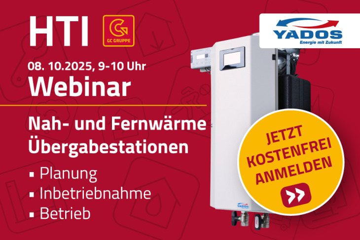 Am 08. Oktober 2025 laden wir Sie gemeinsam mit der HTI Gruppe zum Online-Seminar ein. Von 9:00 bis 10:00 Uhr zeigt Ihnen YADOS Produktmanager und Wärmenetz-Experte Lutz Birnick, worauf es bei Planung, Inbetriebnahme und Betrieb moderner Wärmeübergabestationen ankommt.